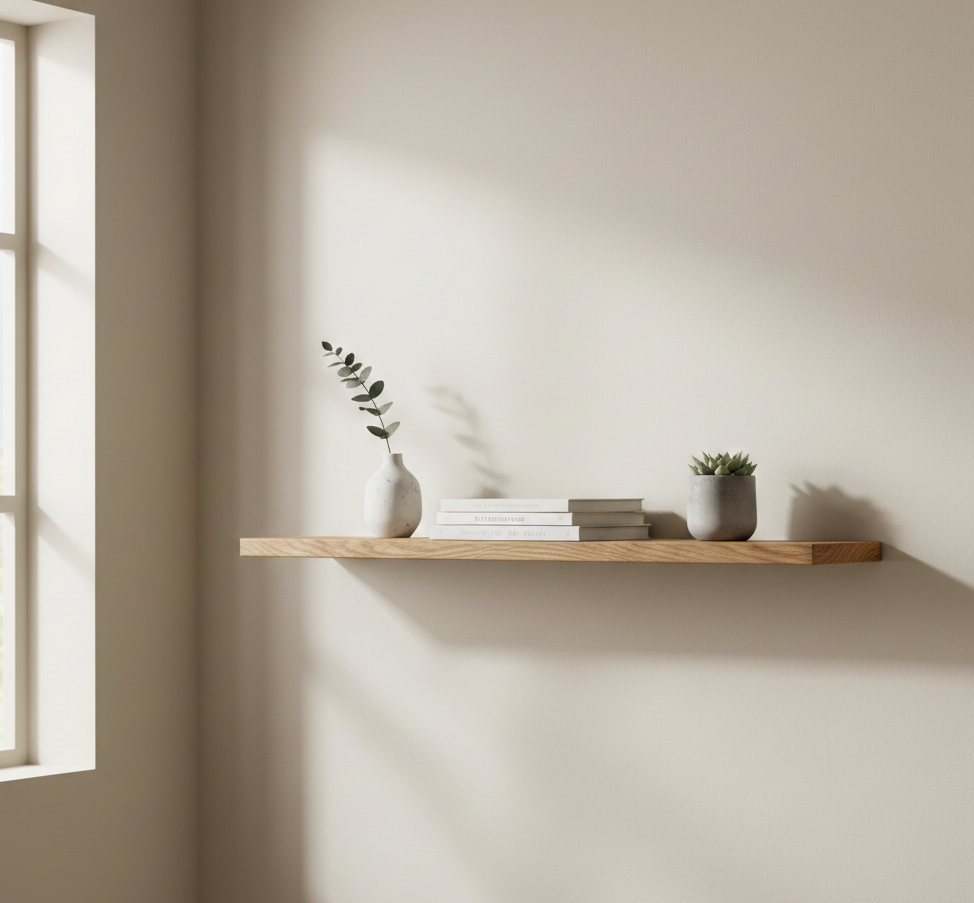 Лаконічна настінна полиця з чистими лініями та стриманим виглядом.